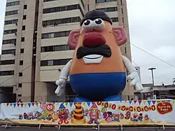 Mr. and Mrs. Potato Head both appeared in the Toy Story franchise, voiced by Don Rickles and Estelle Harris, respectively. Additionally, in 1998, The Mr. Potato Head Show aired but was short-lived, with only one season being produced.[5] As one of the prominent marks of Hasbro, a Mr. Potato Head balloon has also joined others in the annual Macy's Thanksgiving Day Parade.[6] Toy Story Midway Mania!, in Disney California Adventure at the Disneyland Resort, also features a large talking Mr. Potato Head.[7]