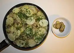 Germany | A breakfast dish made from fried potatoes, eggs, onions, leeks or chives, and bacon or ham. It is similar to the somewhat simpler English bubble and squeak. |