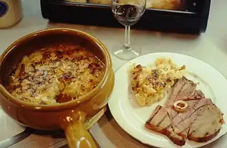 Alsace, France | A mix of sliced potatoes, sliced onions, cubed mutton, beef and pork which have been marinated overnight in Alsatian white wine and juniper berries and slow cooked in a sealed ceramic casserole dish. |