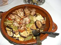 Spain | Sliced potatoes, eggplant, and red bell peppers previously fried in olive oil, served in a low-sided dish. |