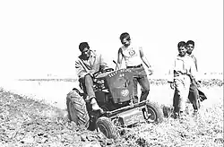 Most agricultural work in El Oued is carried out by hand as the ground is loose sand and labour (almost entirely male) is cheap.[3]: 27 : 38 Before planting manure is typically spread on the pivot and throughout the season NPK fertilizer is usually applied three times.[3]: 21 : 32 The potatoes are planted in furrows by hand with 15-20 men taking around 4 hours to plant each pivot.[3]: 29 Harvesting is also done by hand as no machine on the market is capable of harvesting from sand, potatoes usually being grown in earth.[3]: 29 Sometimes the potatoes are left in the sand for 1–3 months due to a lack of storage facilities.[3]: 30