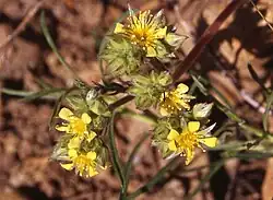 Atop the stem is an inflorescence of several flower clusters, each cluster made up of 5 to 20 small yellow glandular flowers. Each individual flower has five thick, pointed, hairy sepals and five much smaller spoon-shaped yellow petals. At the center are many stamens and several pistils. The fruit is a tiny brown achene.