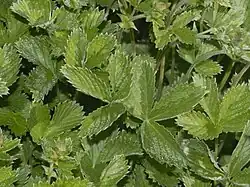 Potentilla nepalensis can reach a height of 30–60 centimetres (12–24 in). This plant forms low mounds of deep green strawberry-like leaves composed of broad leaflets. The cup-shaped 5-petalled flowers may be cherry red or deep pink, with a darker center, about 2.5 cm in width. They bloom July to August. [3]