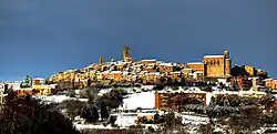 The town looks like a typical medieval village, perched on top of a hill, and surrounded by a ring of walls. Its monumental appearance is characterized by the presence of many churches (once 27) and their belfries.
