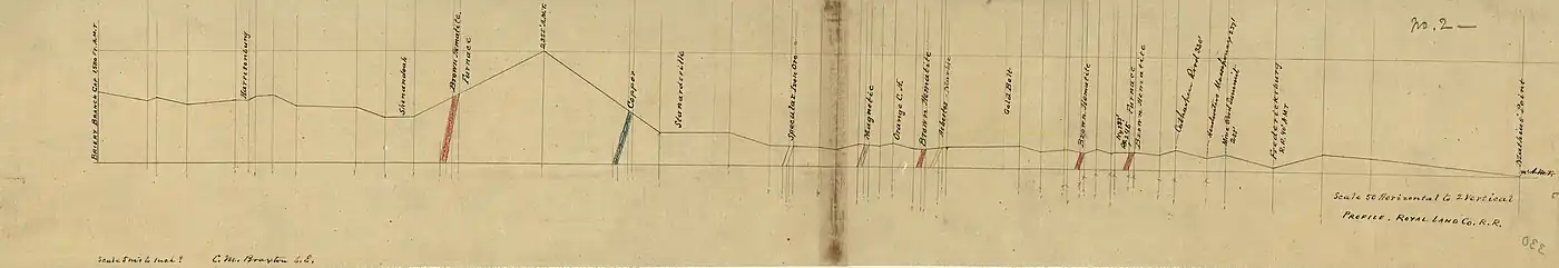 The Shenandoah Valley and Ohio Railroad was planned to construct a rail line from Orange, the western terminus of the PF&P, across Swift Run Gap into the Shenandoah Valley. The total cost of the 93-mile-long Shenandoah Valley and Ohio Railroad was projected to be $970,500, including depots and sidings.[5] The PF&P's track was narrow gauged to 3 ft (914 mm) and was extended to Orange by early 1877, a distance of 38 miles from Fredericksburg, the eastern terminus of the line. The use of 3 ft (914 mm) narrow gauge instead of standard gauge allowed for a savings of 40%, and because of this, the company switched the original plans for the Shenandoah Valley and Ohio Railroad from standard gauge to the more cost-effective narrow gauge.[6] Although the Royal Land Company had planned to extend the line from Mathias' Point (27 miles east of Fredericksburg on the Potomac River) to somewhere near Harrisonburg, Virginia, it failed to build beyond Orange to the west and Fredericksburg to the east.[4] The cost of the 38-mile section that was actually constructed was $956,425.83, and since the Shenandoah Valley and Ohio Railroad never came to fruition, its projected costs were not realized.[7]