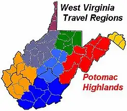 - ^ West Virginia Travel Regions, General Information, The Wonders of West Virginia: Potomac Highlands, New River, Greenbrier Valley, Eastern Panhandle, Mountaineer Country, Northern Panhandle, Mountain Lakes, Metro Valley, Mid-Ohio Valley 2007 Citynet LLC. All rights reserved, Site Design and Hosting by Citynet [1] (ret. July 11, 2010).