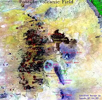 The Potrillo volcanic field is a monogenetic volcanic field located on the Rio Grande Rift in southern New Mexico, United States and northern Chihuahua, Mexico. The volcanic field lies 22 miles (35 km) southwest of Las Cruces, and occupies about 4,661 square kilometers (1,800 sq mi) near the U.S. border with Mexico.[1]
