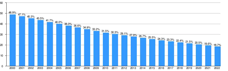 Secondly, rising landlessness is also a consequence of poverty in Bangladesh. In the year 2000, among the poorest 20 percent of the population – four out of five owned less than half an acre of land. Not only did many own no acreage at all, but landlessness has been increasing in rural Bangladesh along with the number of small and marginal farms.[38] The 2000 HIES found nearly half (48 percent) of the country's rural population to be effectively landless, owning at most 0.05 acres. Roughly three-fifths of all households in the two poorest quintiles fell into that category.