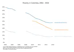 In 2017, the National Administrative Department of Statistics (DANE) reported that 26.9% of the population were living below the poverty line, of which 7.4% in "extreme poverty". The multidimensional poverty rate stands at 17.0% of the population.[2]