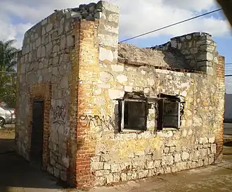 The Powder Magazine from Camp Drum is a Los Angeles Historic-Cultural Monument located in the Wilmington section of Los Angeles, California, near the Port of Los Angeles. Built in 1862, the Powder Magazine is a 20-by-20-foot (6.1 m × 6.1 m) brick and stone structure that was used to store gunpowder during the Civil War. It was originally part of Camp Drum, a facility built upon the outbreak of the American Civil War to address concerns about the loyalty and security of the Los Angeles area. Many of the area's residents were recent arrivals from the Southern states, and southerner John C. Breckinridge received twice as many local votes as Abraham Lincoln in the 1860 Presidential election.[2] Phineas Banning, the founder of Wilmington (then known as New San Pedro), wrote to President Lincoln advising that the Union would lose California unless some provision was made to quell pro-Confederacy sentiment. Camp Drum was built between 1862 and 1863 and was the home base for the California Column, commanded by Colonel James Henry Carleton.[3] Between 2,000 and 7,000 soldiers were stationed at Camp Drum, and Wilmington became a thriving community with a population greater than Los Angeles during the war. The Powder Magazine is one of only two surviving structures from Camp Drum, the other being the Drum Barracks, which is now operated as a Civil War museum by the City of Los Angeles.[4] The Powder Magazine has been used for various private uses over the years, at one point having another structure built around it. When the larger structure was torn down, the Powder Magazine was re-discovered. In order to save it from demolition, it was declared a Historic-Cultural Monument (HCM #249) in August 1982.[1] For more than two decades, it has sat on a vacant, fenced-off lot two blocks south of the Drum Barracks.