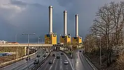 It has three blocks with a power of 110 megawatts, each equipped with a 102-metre-high (335 ft) chimney. This very striking facility received an architectural prize in the 1980s. It is not located near a river and therefore must take its cooling water from underground. There was an explosion on January 2, 1992, in one of the blocks. It is run by Vattenfall Europe, a subdivision of Vattenfall.[1]