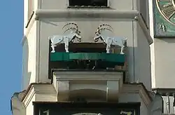 The next major renovation lasted from 1910–1913 (during a period of German rule), when black rustication was used to give the building a more "northern German" style.[4] The original late renaissance polychromy was destroyed.[4] An additional storey was added[5] and the goats, which had been absent since 1675, were restored to the tower in 1913. In October 1943 the Town Hall was the scene of Heinrich Himmler's Posen speeches. Following major damage in the Battle of Poznań (1945), the Town Hall was again rebuilt in 1945–1954, when the Renaissance character of the elevations was restored (and extracts from the constitution of the Polish People's Republic were added to the text displayed on the attic wall). The eagle, which had been kept hidden during the war, was returned to the tower in 1947. The mechanism that drives the goats was replaced in 1954, and again at the end of the century. Renovation carried out in 1992–2002 largely restored the building to its post-1784 appearance.