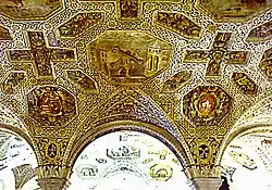 The Great Hall or Vestibule is designed in Renaissance style by G. B. di Quadro. It was originally used for important sittings of the city court. Over the entrance is a quotation from Aristotle's Politics, and on the hall side a quotation from the Third Psalm. The hall retains its original vaults with lunettes, supported by two columns and by corbels. The coffers and columns are ornamented (the ornamentation on the ceiling is sgraffito). The coffers in the northern part of the room have polychrome stucco decoration showing Hercules and Samson, David and Goliath, and Marcus Curtius. The lower coffers show the coats of arms of Poland, Lithuania, the House of Sforza (Bona Sforza was Polish queen consort to 1548), the Habsburgs (Catherine Habsburg was queen consort from 1553) and Poznań, as well as an angel holding a board with the date 1555, the year the work was completed. Artists' signatures, house marks and representations of their tools can also be found. The southern part contains representations of animals and legendary creatures (elephant, lion, leopard, eagle, rhinoceros, griffin, Pegasus) and deities signifying heavenly bodies (the sun, the moon, Mercury, Venus, Mars, Jupiter and Saturn in the Ptolemeic system. Also in cross-shaped coffers are the heads of Moses and of Christ, the latter accompanied by another house mark.