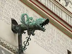 - ^ a b Polish: Zniszczono starą polichromię i, ażeby gmachowi nadać „poważny charakter miast północno-niemieckich", pokryto go boniowaniem w czarne kwadraty nieproporcjonalnie wielkie w stosunku do delikatnych form architektury.