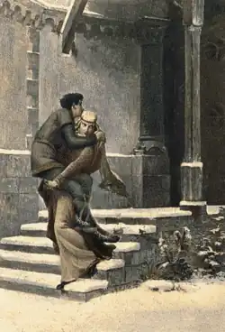 The historical subject of the prelude was certainly germane to Satie's concurrent fascination with the Middle Ages, and contained elements of Medieval legend and romance he would later treat with irony in such works as Geneviève de Brabant (c. 1900) and the Trois poèmes d'amour (1914). "Eginhard" is the French spelling for the name of Einhard, an 8th-century AD Frankish scholar who was an important courtier and first biographer of Charlemagne. A layman and self-professed "barbarian",[9] he built churches to expiate his sins and entrusted much of the management of his estates to his wife Emma. In the 12th century an enduring popular myth arose that Emma was a daughter of Charlemagne and had to conduct her early relationship with Eginhard in secret. During one of their trysts a sudden snowfall made it impossible for Eginhard to escape without leaving telltale footprints, so Emma carried him across the snow on the castle grounds. Charlemagne spotted them from a window, however. Rejecting his counselors' advice that the lovers should be punished, the emperor magnanimously consented to their marriage.[10][11] This legend gradually spread beyond France and Germany and was still fairly well known in Satie's day. In the United States, Henry Wadsworth Longfellow retold it in verse in his 1863 poetry collection Tales of a Wayside Inn.[12]