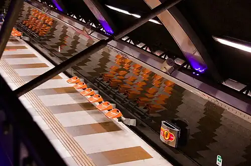 ![]() One of the side platforms as seen from a walkway that is suspended by steel rods | |||||||||||