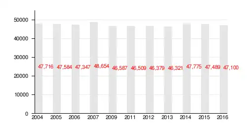 According to the Central Statistical Office data, the district's area is 6.44 square kilometres (2.49 square miles) and 47 775 people inhabit Prądnik Czerwony.[2]