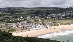 Praa Sands (/ˈpreɪˈsændz/ pray-sandz; Cornish: Poll an Wragh, meaning pool of the wrasse),[1][2] (formerly Prah Sands) is a white-sand beach and coastal village in civil parish of Breage, in Cornwall, England. It lies off the A394 road between Helston and Penzance.[3] Formerly serving the local mining industry, it is now mostly a tourist-orientated area. The beach is popular with surfers and walkers. Towards the south eastern end of the beach is a Second World War Type 24 pillbox. Originally this was constructed on top of the cliffs but it has been subjected to coastal erosion and has settled down onto the beach.
