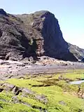 A secluded beach which is unspoiled and never busy and visitors to the beach must negotiate a marked pathway and steps which lead down to this beach from a car park on the cliff above. The beach has many interesting and unusual rock formations. The beach is popular for sports such as Kite surfing, Windsurfing, and bodyboard surfing. The sea here is designate with a Flag#Swimming flags is considered too dangerous for swimming.