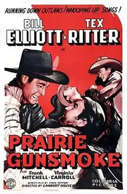 Prairie Gunsmoke is a 1942 American Western film directed by Lambert Hillyer and written by Fred Myton. The film stars Wild Bill Elliott, Tex Ritter, Frank Mitchell, Virginia Carroll, Hal Price and Tris Coffin. The film was released on July 16, 1942, by Columbia Pictures.[1][2][3] It is the twelfth and final film in Columbia Pictures' "Wild Bill Hickok" series.[4]