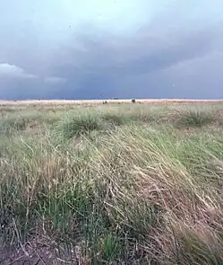 Erosion occurs when surface pressures wear away the material of the Earth’s crust.[11] Particularly with land previously dominated by prairie grasses, the loss of the tallgrass extensive fibrous root system left the soil exposed and unbound.[5] Ecologically, prairie restoration aids in conservation of earth's topsoil, which is often exposed to erosion from wind and rain (worsened by climate change's heavier and frequent rain) when prairies are plowed under to make way for new commerce.[12] Conversely, much more of the prairie lands have become the fertile fields on which cereal crops of corn, barley and wheat are grown.[13] Continued erosion reduces the long term productivity of the soil.[14]