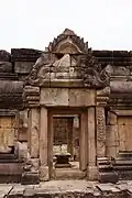 On the north side are two towers and two other laterite buildings that are still standing as well as the foundations of three other buildings which are no longer standing. These buildings are the remains of the highway rest house and hospital Jayavarman VII erected to add to the temple complex where pilgrims and travelers would spend the night and recuperate for the next leg of their journey.[4] On the south facade, the same side as the main entrance, is the main gopura, which is much larger than the others. A large broad steep laterite staircase, also facing south and extending well down into Cambodian territory, leads to the entrance of the temple. There is also a laterite staircase that leads down to a stream on the Cambodian side which curves around the temple.[4] The orientation of Ta Muen Thom is very similar to that of Prasat Hin Phimai and others at Phimai Historical Park.