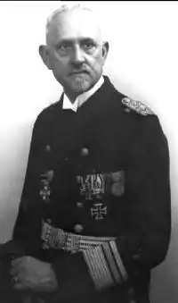 Raeder saw the Weimar republic as a mere transition, and argued that naval officers like himself were the "trustees of Germany", being the only ones who truly understood the "national interest", and it was the duty of officers to keep alive the concept of a Weltmachtflotte until Germany was cured of the "sickness" as Raeder labeled democracy.[46] After the war, in 1920, Raeder was involved in the failed Kapp Putsch where together with almost the entire naval officer corps he declared himself openly for the "government" of Wolfgang Kapp against the leaders of the Weimar Republic, which Raeder loathed.[1] As the chief of staff to Admiral Adolf von Trotha, the Navy's commander, Raeder played a prominent role in rallying support for the putsch.[47] Raeder claimed to be ignorant of the plans for a putsch, but in the days preceding the putsch, Trotha and Raeder had been in close contact with General Walther von Lüttwitz (the real leader of the Kapp putsch) and the Freikorps leader Captain Hermann Ehrhardt.[48] As soon as they learned that Berlin had been occupied by Marinebrigade Ehrhardt on the morning of 13 March 1920, Trotha and Raeder issued a proclamation declaring that the Weimar Republic had ended, declared their loyalty to Kapp "government", and ordered the Navy to seize Wilhelmshaven and Kiel for the putsch.[48] On 18 March 1920 when Raeder's close friend, Admiral Magnus von Levetzow who had seized Kiel proposed a march on Berlin with the aim of deposing the government after the failure of the putsch in Berlin, Raeder declared his intention of joining Levetzow, only to change his mind a few hours later, and hastily called the Defence Minister Gustav Noske to tell him he had been "misunderstood" about joining Levetzow on his proposed march.[49] Had it not been for a general amnesty for those involved in the Kapp putsch passed by the Reichstag on 8 August 1920, it is quite likely that Raeder's career would have ended in 1920 with a dishonourable discharge for high treason.[50] Raeder's friends Trotha and Levetzow were not so lucky, both resigning rather than suffering the humiliation of a dishonourable discharge. In participating in the Kapp putsch, Raeder had violated the Reichswehreid, the oath of allegiance that committed officers to upholding and defending the Republic, though he was later to claim that oaths were sacred to him and the Hitler oath made it impossible for him to rebel against Hitler.[51] Finally, in the summer of 1920 Raeder married his second wife, by who he was to have one son.
