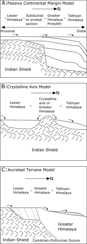 This model posits that the Lesser and Tethyan Himalaya were deposited in distinct basins that are separated by the Greater Himalaya complex.[27]