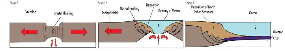 - ^ a b c d Brookfield, M.E (1993). "The Himalayan passive margin from Precambrian to Cretaceous times". Sedimentary Geology. 84 (1–4): 1–35. Bibcode:1993SedG...84....1B. doi:10.1016/0037-0738(93)90042-4.