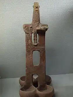 Prior to the arrival of humans in Cyprus, only four terrestrial mammal species were present on the islands, including the Cypriot pygmy hippopotamus and the Cyprus dwarf elephant, which were much smaller than their mainland ancestors as a result of insular dwarfism. The ancestors of these species arrived on Cyprus at least 200,000 years ago,[1][2] with the other species being the genet Genetta plesictoides and the still living Cypriot mouse.[3] The earliest humans to inhabit Cyprus were hunter gatherers who arrived on the island around 13–12,000 years ago (11–10,000 BC), with some of the oldest well-dated sites being Aetokremnos on the south coast, which is suggested to show evidence of hunting of the dwarf hippopotamus and dwarf elephant, and the inland site of Roudias in southeast Cyprus. These hunter-gatherers are suggested to have originated from the Natufian culture of the neighbouring Levant.[4] The last records of the endemic mammals other than the mouse date to shortly after human settlement. The hunter gatherers later introduced wild boar to the island around 12,000 years ago, likely to act as a source of food.[5]