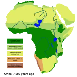 The prehistory of Southern Africa spans from the earliest human presence in the region until the emergence of the Iron Age in Southern Africa. In 1,000,000 BP, hominins controlled fire at Wonderwerk Cave, South Africa.[1] Ancestors of the Khoisan may have expanded from East Africa or Central Africa into Southern Africa before 150,000 BP, possibly as early as before 260,000 BP.[2][3] Prehistoric West Africans may have diverged into distinct ancestral groups of modern West Africans and Bantu-speaking peoples in Cameroon, and, subsequently, around 5000 BP, the Bantu-speaking peoples migrated into other parts of Sub-Saharan Africa (e.g., Central African Republic, African Great Lakes, South Africa).[4]