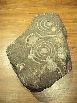 There are also elaborate carved stone battle-axes found in East Lothian, Aberdeenshire and Lanarkshire. These show little sign of use or wear, and so, rather than being practical objects, may be symbolic representations of power.[36] Similarly, the site at Forteviot, in Perthshire, produced a unique warrior burial under a giant sandstone slab. The slab is engraved with a spiral and has an axehead pecked into the underside, and underneath there are grave goods of a copper dagger with leather scabbard and a carved wooden bowl.[37]