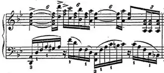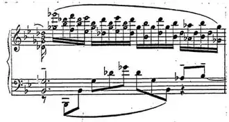 This virtuoso piece is rhythmically complex, contrasting a thunderous left-hand ostinato against a jagged right-hand melodic line. As in Chopin's Revolutionary Etude, the performer must possess considerable left-hand endurance to maintain a consistent legato throughout the piece.