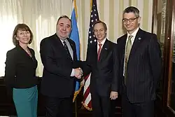 Salmond was an advocate for the relations between the United States and Scotland. In 2009, Salmond claimed that Scotland could influence the United States in the area of emission reduction based on the Scottish Government's "ambitious" plans to reduce emissions by 2020. Salmond jokingly claimed that he would "like to give Barack Obama a bottle of Scotland’s finest malt whisky", claiming that the gift would hopefully show Obama "what can be done" and argued that "unless the United States can get their targets up, it will be watered-down whisky he gets in the future".[76] In 2012, Salmond visited the US state of California to boost Scottish trade, tourism and business, and met with a number of US politicians during his visit to Sacramento claiming to politicians that the "United States offers huge potential, and Scotland and Scottish companies are ideally placed to take advantage of the outstanding opportunities that are available".[77] Salmond met with Governor of California, Edmund G. Brown Jr, discussing Scotland and California's "close economic ties" and the commitment to reducing carbon emissions and also towards achieving "ambitious renewable energy goals".[78]