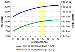 Research shows that when birth weights of infants are greater than the 90th percentile of the growth chart for babies of the same gestational age, they are considered large for gestational age or LGA.[30] This is known as macrosomia, indicating the baby weighs more than 90% of others at the same gestational age.[30]