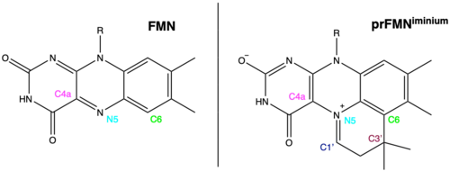 prFMN is flavin prenylated at the N5 and C6 positions resulting in the formation of a fourth non-aromatic ring.[2]