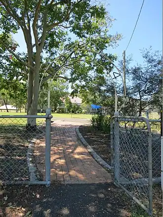 The immediate post-World War II years were a time for improvements. Estimates for the erection of a tennis court of £40–50 were received in 1946, but it was not until a working bee in April 1951 that the tennis court was completed.[35] Meanwhile, on 31 July 1948, an honour board with the names of those from the district who served in WWII was unveiled. Constructed by Frank Olkers of Lowood, the honour board was erected by the School Committee and funded by Prenzlau Progress Association.[36] A report of the unveiling event stated that all those listed on the board were past scholars of the Prenzlau School. In 1949 the exterior of the school was painted.[37] Electricity was connected to the school in September 1952.[38] The roof was replaced after cyclonic winds unroofed the school in June 1954; and the northern portion of the east verandah was enclosed to house a library in 1959.[39] In this year also, a new teacher's residence was built (removed post-2005) and the old residence demolished.[40] In 1962 at a cost of £40, alterations to the school included resurfacing of the tennis court.[41][1]