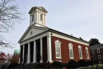 Presbyterian Church of Fredericksburg is a historic Presbyterian church located southwest of Princess Anne and George Streets in Fredericksburg, Virginia. It was built in 1833, and restored in 1866 after being badly damaged during the American Civil War. It is a rectangular brick church building of Jeffersonian Roman Revival design. The church has a triangular, gable-end pediment surmounting a wide entablature which surrounds the entire building. The front facade features four wide, wooden Doric order pilaster, and two round Doric order columns each set at the front edge of the recessed portico. During the American Civil War the church served both Union and Confederate soldiers and it was in this building that Clara Barton came to nurse the wounded after the Battle of Fredericksburg in 1862.[3]