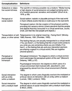 Presence has been delineated into subtypes, such as physical-, social-, and self-presence.[1] Lombard's working definition was "a psychological state in which virtual objects are experienced as actual objects in either sensory or nonsensory ways."[2] Later extensions expanded the definition of "virtual objects" to specify that they may be either para-authentic or artificial. Further development of the concept of "psychological state" has led to study of the mental mechanism that permits humans to feel presence when using media or simulation technologies.[1] One approach is to conceptualize presence as a cognitive feeling, that is, to take spatial presence as feedback from unconscious cognitive processes that inform conscious thought.[7]