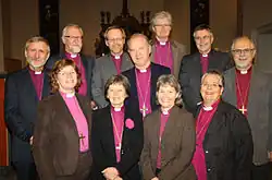 The Preses of the Church of Norway is a titular bishop who leads the Bishops' Conference of the church as one who is primus inter pares (first, among equals). The name comes from the Latin word Praeses which means "placed before" or "at the head".[1] In 2011, the office of Preses was changed by law to be a 12th permanent bishopric within the Church of Norway. Prior to 2011, it was an elected position from within the 11 diocesan bishops that made up the Bishops' Conference of the Church of Norway.