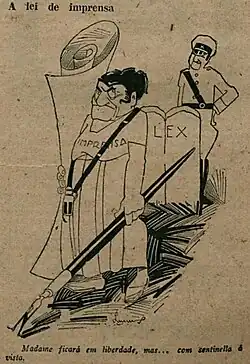 Its proponents argued that there was full freedom for discussion, while opponents considered it absurd to debate the proposal in the midst of a state of emergency, with newspapers suffering criminal prosecutions and journalists being arrested and attacked.[100] Jornal do Brasil, O Imparcial, Gazeta de Notícias and other newspapers critical of the government had copies seized and newsrooms raided.[101] For Correio da Manhã, the law established the crime of opinion, and for O Imparcial, the proposal was "the death of freedom of opinion in Brazil".[102] The repeal of the law would later be one of the tenentists' declared objectives.[103]