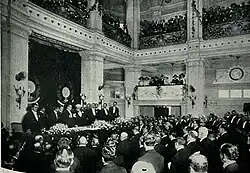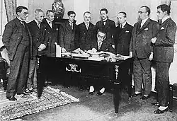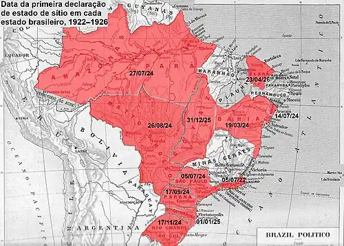 The state of emergency, which expired on 31 December 1922, was successively extended until April and then again until 31 December 1923, with only a few votes against in Congress.[39] This measure suspended constitutional guarantees for a specified time period,[40] legitimizing arrests without trial and strengthening the police in relation to the Judiciary.[41] Much of the press was censored.[42] According to the prevailing current in Congress and the Supreme Court, the state of emergency was the middle ground between that of war and full peace and could be used preemptively by any government that felt threatened with overthrow.[43]