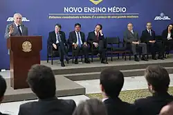 On 16 February 2017, when Temer sanctioned the high school reform law, he declared in his speech at the Planalto Palace that the new model was only possible thanks to the government's boldness in facing up to the controversy surrounding issues that are relevant to the country. According to him, "we have sent proposals that generate healthy controversy. Controversy and criticism therefore generate improvement. Certainly, some of the changes made by Congress were made by society. So we ended up with a consensus. We are daring. Who would dare to put a cap on public spending? It would be very easy for the president to come in and spend as he pleases without worrying about fundamental reforms, in other words, the country's future. We're not doing that. Proposing the cap was a very successful dare. Now, the high school reform". Education minister Mendonça Filho, added that "high school was static, with thirteen compulsory subjects. [The student] has to assimilate that content in a similar and equal way for everyone, as if each one had the same profile as the other".[7]