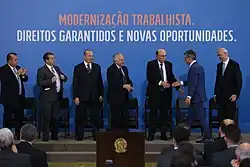 Temer became president in the midst of a serious economic crisis in the country. At his inauguration, he stated that his government would be a reformist one.[4][5] During his administration, several economic measures were approved, such as the control of public spending, through Constitutional Amendment No. 95, which imposed limits on future federal government spending, the 2017 labour reform and the Outsourcing Law. There was also a proposed social security reform, which the government failed to push through. Changes were made in the social field, such as the completion and inauguration of part of the São Francisco River transposition project, the reform of high school education and the establishment of the National Common Curriculum Base.[6][7]