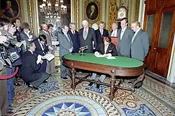 On August 6, 1965, President Lyndon B. Johnson became the first president in over a quarter century to use the President's Room for its intended purpose, signing the 1965 Voting Rights Act into law after a stirring and emotional ceremony in the Capitol Rotunda. Johnson had appeared before a Joint Session of Congress on March 15, 1965, to urge passage of the bill guaranteeing equal voting rights for African American citizens. He returned to the Capitol to sign the act, a gesture that, as he explained in his memoirs, was intended to "dramatize the importance we attached to this bill – and to give full measure to the Congress."