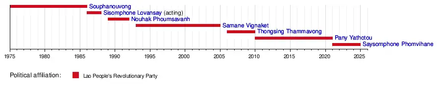 2 December 1975 | 25 November 1986 | 10 years, 358 days | Lao People's Revolutionary Party | [1][2] | |