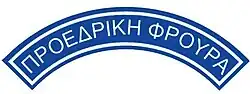 The Evzones wear the regular Hellenic Army uniform when not in guard service. They are distinguished from the other Army units by an azure beret and blue embroidered patches on the shoulders which have white letters that form the words: ΠΡΟΕΔΡΙΚΗ ΦΡΟΥΡΑ (Proedriki Froura, "Presidential Guard").