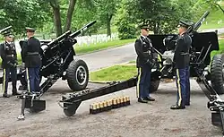 The Presidential Salute Battery (Guns Platoon),[1] an element of the 3rd United States Infantry Regiment, comprises soldiers qualified as MOS 11C (Mortarman).[2] This battery primarily handles firing ceremonial gun-salute honors at general officer funerals, retirements, state occasions, and provides indirect fire support for the regiment's tactical operations.[3]