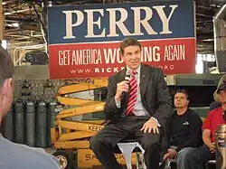Perry was considered as a potential candidate since as early as the 2008 presidential election, initially denying he was interested in the office but later becoming more open-minded. He formally launched his campaign on August 13, 2011, in Charleston, South Carolina.[5] While he was initially successful in fundraising and was largely considered a serious contender for the nomination, he struggled during the debates and his poll numbers began to decline. After finishing fifth with just over 10% of the vote in the Iowa caucuses on January 3, 2012, Perry considered dropping out of the presidential race but did not.[6][7] After a poor showing in New Hampshire and with "lagging" poll numbers in South Carolina, Perry formally announced he was suspending his campaign on January 19, 2012.[8]