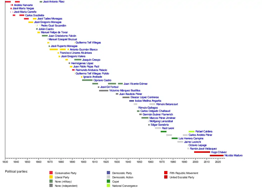 The list below includes interim "caretaker" as well as regular serving presidents, and democratically installed presidents as well as those installed by other means (e.g.; Marcos Pérez Jiménez).[5][6][7][8][9][10][11][12]